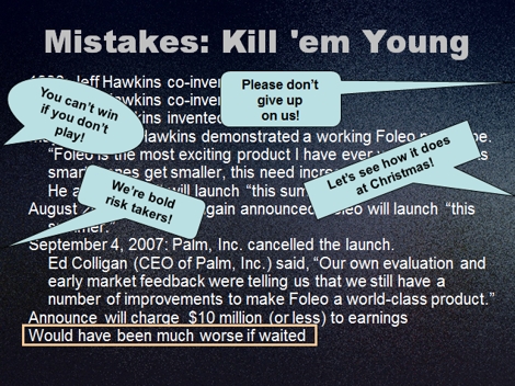 I use this learning activity after a lecture component on avoiding the bias of irrational escalation of committment during new product development. I have found that students easily understand the bias when it is described in a lecture. However, I believe that in practice, students will be more resistant to the bias if they have a better understanding of the types of arguments that are often given in support of escalating committment. Furthermore, I believe students will be more resistant to this bias if they have some practice in refuting these supporting arguments. My thinking here is consistent with inoculation theory -- the classic model of persuasion that proposes people are more resistant to counter-persuasion if they are given weak versions of counter-arguments and then given practice in refuting them (McGuire 1961). Initially, this learning activity appears to be a vivid example (a best-practices example). However, in the last part of the activity I give students examples of the different types of arguments that are sometimes offered in support of escalating committment in NPD, and in a class discussion I give students practice in analyzing and refuting the arguments. |