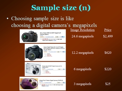 As part of a class session on research design, I discuss the topic of choosing a sample size. I use this learning activity immediately prior to a lecture component on statistical power and the relationship between sample size and confidence intervals. My pupose in creating this extended metaphor is to build my student's intuition about the advantages and disadvantages of large sample sizes. As shown in the screen shot from my PowerPoint presentation, I describe four different digital cameras with image resolution ranging from 3 megapixels to 24.6 megapixels. I describe how photos taken with the highest-resolution camera have fantastic image clarity, whereas photos taken with the lowest-resolution camera have relatively poor image clarity. To drive this point home, I produce two mounted 14" x 19" photos, and I pass them around the class. One photo is a 24.6 megapixel image of customers in front of a store. The other photo is a 3 megapixel version of the same image. As might be expected, the 3 megapixel version suffers from severe digital distortion and pixelation when enlarged that size. I point out that for maximum image clarity, there is no substitute for a high-resolution camera. (With the images that are shown to the right, I have tried to represent what the students see, but the printed photos are more striking.) I then point out that it's possible to enlarge the photos to "zoom in" and closely examine a part of the image that we're particularly interested in. I pass around another pair of large mounted photos. One photo is an enlargement of two customers in the 24.6 megapixel image, and the other photo is the same enlargement from the 3 megapixel image. I point out that if we want to "zoom in" on a particular part of the scene, the 24.6 megapixel image starts to suffer, but the 3 megapixel image is practically useless. I then direct students' attention back to the PowerPoint screen to discuss the prices of the cameras. Obviously, higher-resolution cameras are much more expensive. I ask students to imagine they are taking a photo archive of something important, such as a friend's wedding. I ask students to imagine they have a $2,500 budget for digital cameras to take this photo, but there is a catch: digital cameras can take only one picture, and after taking the one photo, the camera is useless. I ask, "Would you purchase one high-resolution camera? Or maybe four of the 12.2 megapixel cameras? After all, with four cameras you could take four pictures of the wedding. Maybe you could take the four pictures from different angles? Or maybe you could take four pictures at different times of the day? How about the 3 megapixel camera? You could buy 100 of those with your budget. Would you rather have 100 of those?" I do not let this discussion go on too long because it inevitably gets too specific into photographs and stretches the metaphor too thin. For this part of the discussion, I simply want students to recognize that low-resolution photos can be useful for certain things. I finish this extended metaphor by mapping it onto my topic of interest and then summarizing the take-aways: "We've been talking about digital photos, and they are metaphorically similar to sample sizes in survey design. High-resolution photos are a lot like surveys with large sample sizes. They give clarity into what we're seeing, and they let us 'zoom in' and look at specific sub-samples with decent clarity. However, they're very expensive. Low-resolution photos are a lot like surveys with small sample sizes. They give us a pretty good idea of the overall scene, but they do a poor job of letting us 'zoom in' to look at sub-samples. On the other hand, these small-sample studies don't cost nearly as much, which makes them useful for certain tasks." I then move to a lecture component on sample sizes, confidence intervals, and statistical power. I conclude the lecture component with a reprise of the learning points in this metaphor. |