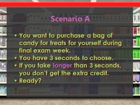 For this learning activity, I do an in-class replication of a classic research finding: the accuracy/effort trade-off in consumer choice. In essence, I run a within-subject experiment with two conditions (restricted effort and high effort). I pass out a form for students to use in marking their choices during the learning activity. As shown here, I establish a consumption scenario that is relevant to the students (candy for final exam week). I create a choice set that includes a few brands of candy that students are unlikely to have tried. I then create a restricted-effort condition by severely limiting the time in which students can make the decision. Based on experience, I have learned that requiring students to make a choice within three seconds of seeing the consideration set is a procedure that reliably produces low-accuracy choices. After a few more choices in other consumption scenarios (which I use for purposes other than those described here), I create a high-effort condition. In this condition, I use the same consumption scenario as the restricted-effort condition, but I emphasize that students now must make the perfect choice for that choice scenario. As part of the manipulation, I say "You sometimes hear about the idea of 'perfect information.' Well, for this choice, I need you to get as close to 'perfect information' as possible. For example, I suspect there are some candies on that list that you have never tried. Is that right? For this exercise, I need you to make a perfectly accurate choice, so I need you to taste the candies. I have brought samples of each candy [small Halloween-sized pieces], and I need you to try each of them." I also add, "If you don't eat candy, or if you're a 'conscientious objector' for some other reason, that's okay. You'll just need to play along. But if you're willing to eat candy, I need you to sample each of these candies." (I have tried this exercise with other product categories such as root beer and fruit juice, but I have never found any product that everyone would try.) I must manage the class carefully at this point, lest the group move too far into a 'class party' atmostphere. I typically need to announce the following a few times: "Remember, this isn't just fooling around. This is work. I need you to make the perfect choice for your consumption scenario. Taste it, read the wrapper for nutritional information, read some online reviews, or gather whatever information you like to make sure you're making the perfect choice for you." After all their choices have been made, I tally the study's results while I stand in front of the class. The aspect of the exercise that is relevant to the effort/accuracy trade-off is the proportion of students whose restricted-effort choice was different from their high-effort choice. The proportion of students with different choices in the two conditions is very high -- usually about 50% of the class. I ask students to explain the reason for their changes in preference, and they often mention they had never tried one of the options, and by trying it they discovered they liked the taste. After exploring the specifics of their choices, I generalize the effect for students by labeling the high-effort choice as "truth." As I explain, "That's as close to 'truth' as we're going to get. I gave you plenty of time to make the choice. I asked you to get any information you liked. I even let you taste it. As near as we can tell, your choice with perfect information was 'truth.' Therefore, anything different from 'truth' would be an inaccurate choice." I then develop the effort/accuracy trade-off with constant reference to the inaccuracy demonstrated in the difference between the restricted-effort choices and the high-effort choices. I also develop the reasons that consumers frequently exert very little effort (e.g., self-imposed limits on decision-making effort rather than an artificial three-second time limit). I find that integrating the lecture component and this learning activity together in a side-by-side manner is effective at "driving home" the concept of the accuracy/effort trade-off. |