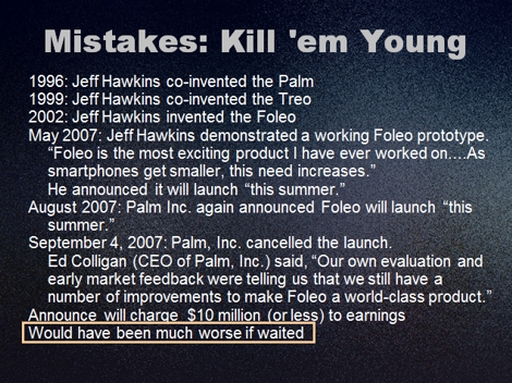 I use this learning activity after a lecture component on avoiding the bias of irrational escalation of committment during new product development. I have found that students easily understand the bias when it is described in a lecture. However, I believe that in practice, students will be more resistant to the bias if they have a better understanding of the types of arguments that are often given in support of escalating committment. Furthermore, I believe students will be more resistant to this bias if they have some practice in refuting these supporting arguments. My thinking here is consistent with inoculation theory -- the classic model of persuasion that proposes people are more resistant to counter-persuasion if they are given weak versions of counter-arguments and then given practice in refuting them (McGuire 1961). Initially, this learning activity appears to be a vivid example (a best-practices example). However, in the last part of the activity I give students examples of the different types of arguments that are sometimes offered in support of escalating committment in NPD, and in a class discussion I give students practice in analyzing and refuting the arguments. |